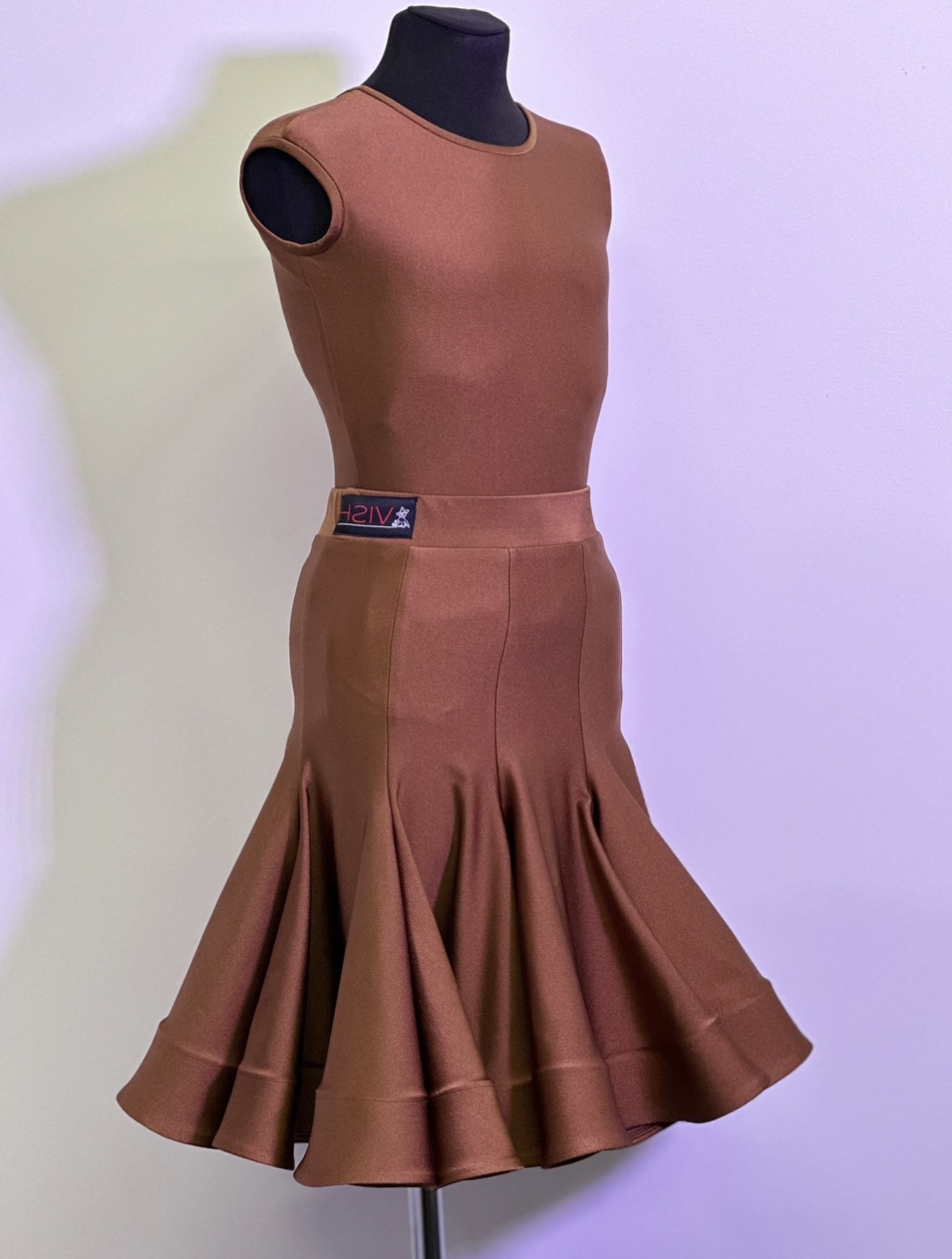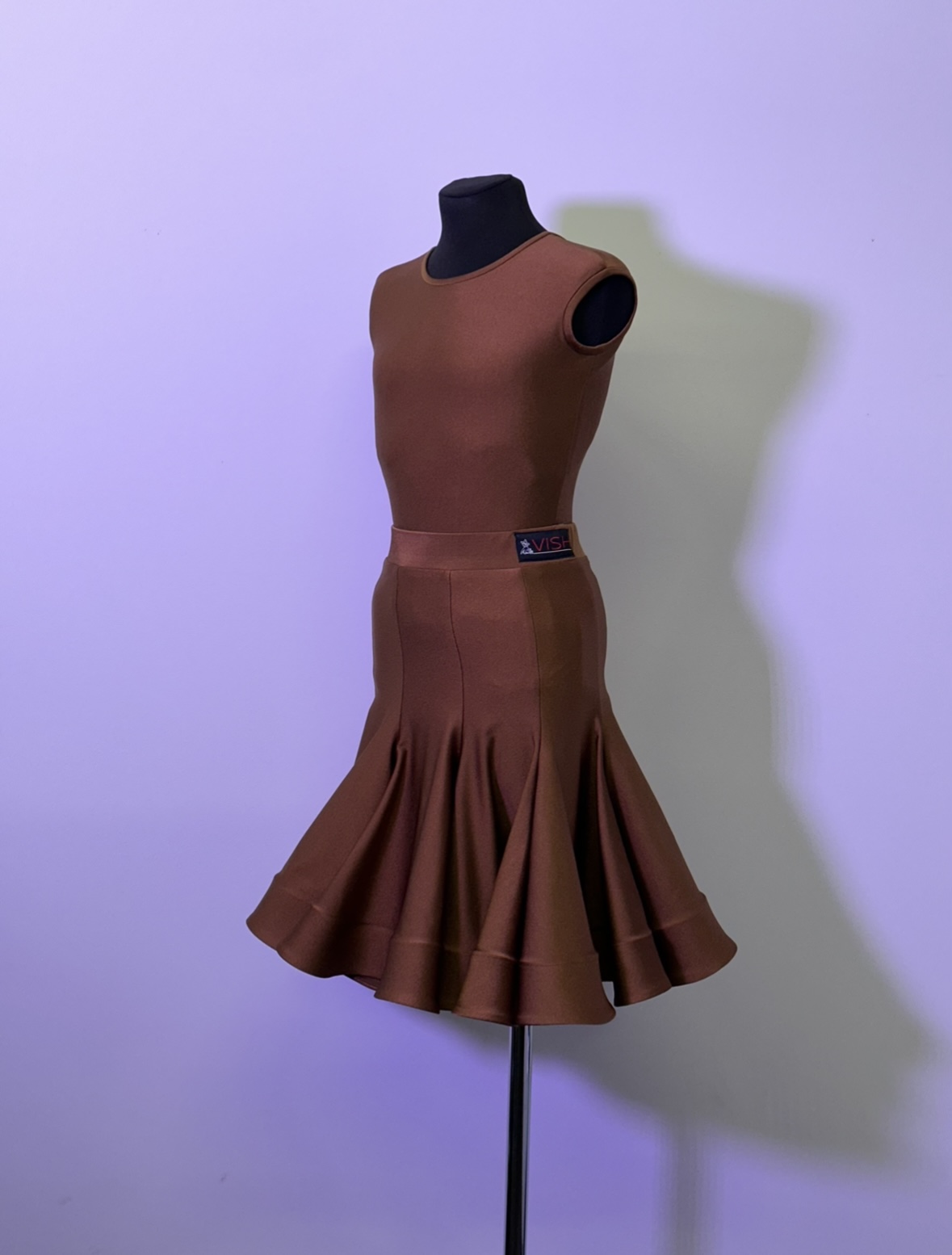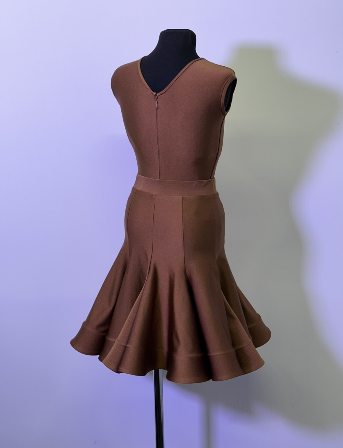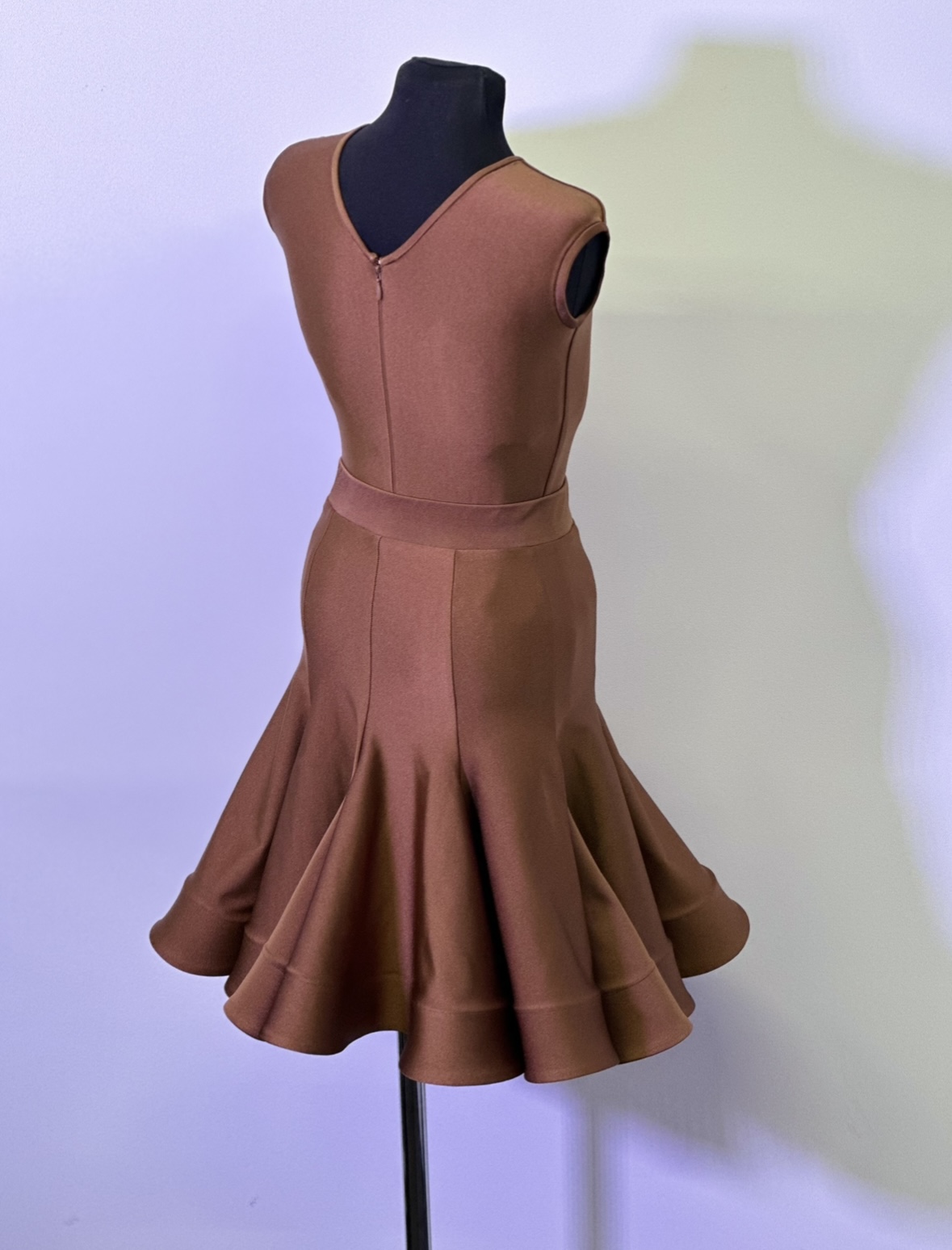 The skirt is set on crinoline, creating volume and a lively swing that enhances every step and turn. Finished in a rich chocolate brown color, this dress offers a classic yet striking look suitable for competitions and performances.