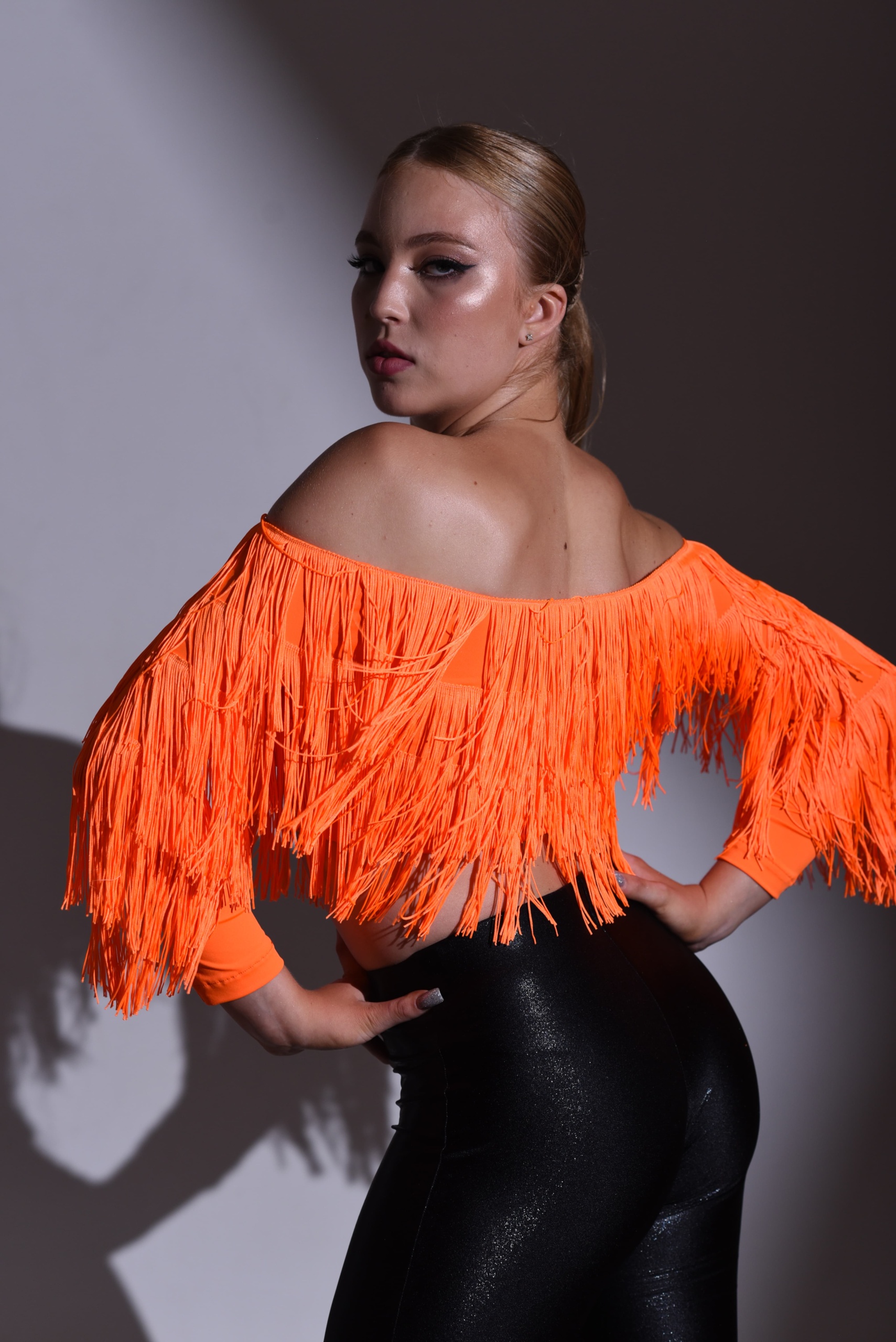 Playful VISH style. Silky fringe, cropped top featuring jet black, sleeves 3/4, open-shoulders, strait shape. Made with super stretchy fabric.